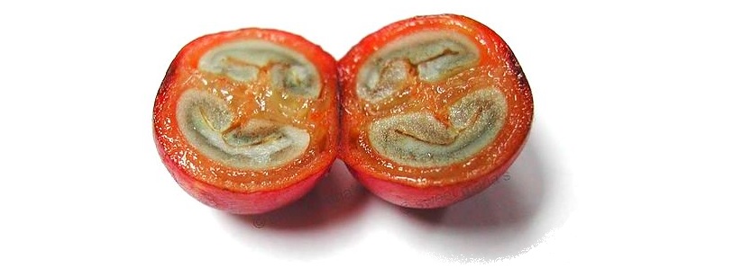 Кофейные зёрна получают из кофейной ягоды, ярко-красных плодов кофейного дерева. Кофейный плод состоит из внешней оболочки, внутри которой как правило две семечки. Эти семена сжаты вместе, что придает им плоскую сторону. Так выглядит обычное кофейное зерно...